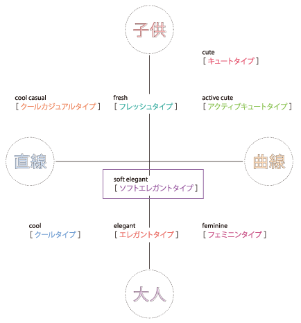 顔に長さがある大人バランスで、直線と曲線の両方をあわせ持つタイプです。このタイプの人は、ソフトで上品かつ落ちついた印象に見られます。また、パーツが小さめ~普通なので優しい印象になります。悩みとしては、必要以上におとなしく、真面目に見られることがあげられます。その場合は、エレガントにもっていきます。カジュアルにしたい場合は、フレッシュにもっていきましょう。